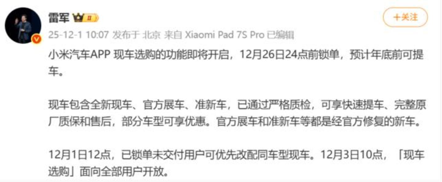 对此,当时有接近小米汽车的人士表示,此举或为接近年关之际,小米期望继续冲击更高年销目标而定。销售现车的方式可以促进此前由于订单时长问题,观望或计划退订的用户更快成交。